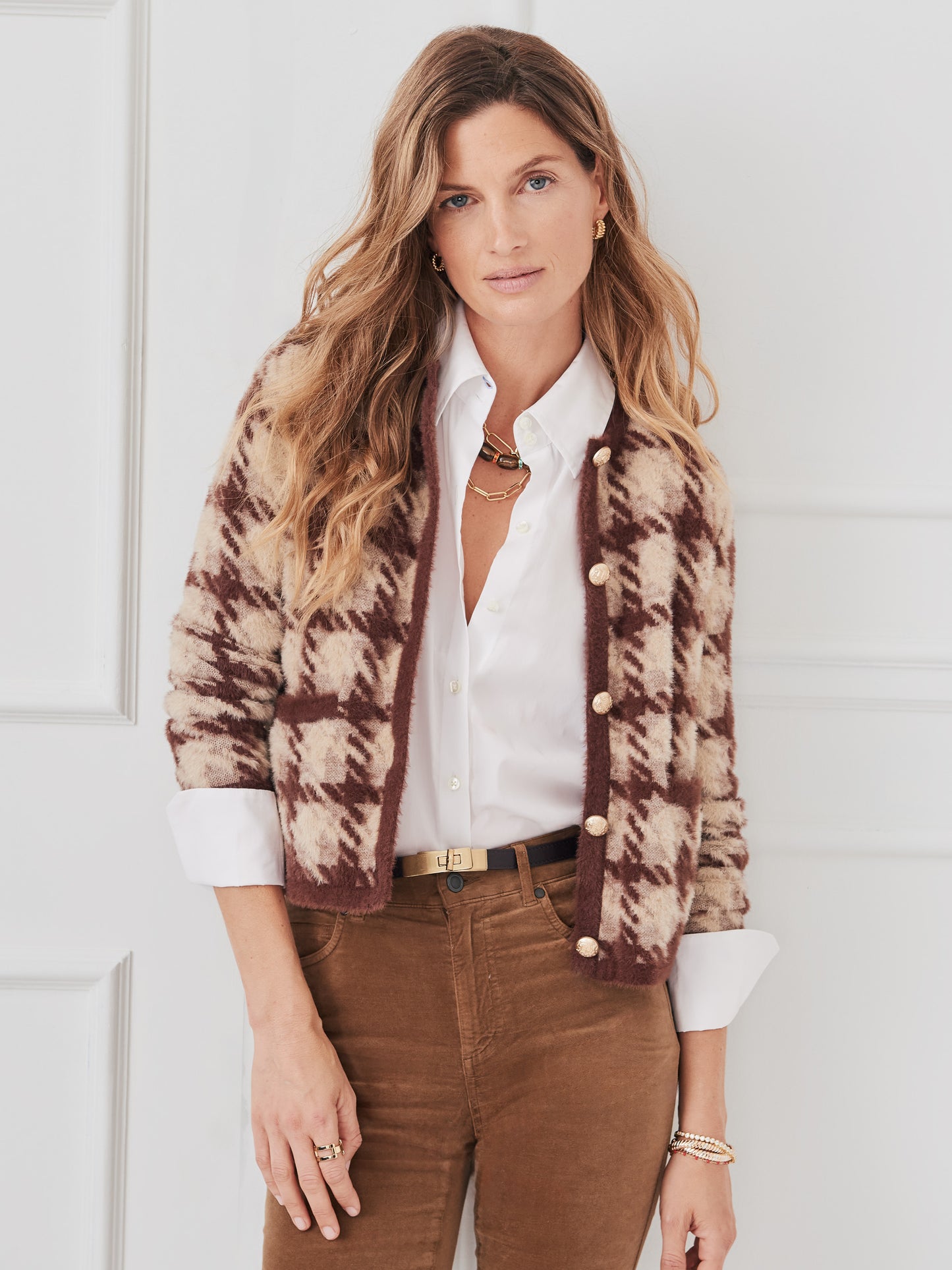 We've taken the classic cardigan and elevated it with special details, from the herringbone pattern, to the soft eyelash knit, to the gold tone crest buttons. It's a must-have piece that goes everywhere, beautifully.